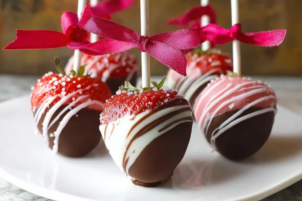 These Chocolate Dipped Strawberries Recipe (Strawberry Pops) are sweet and simple. The pops mix dark chocolate with pink, white, and red candy melts for a pretty look. Pair them with a warm drink like our 5-ingredient hot chocolate for a cozy snack.