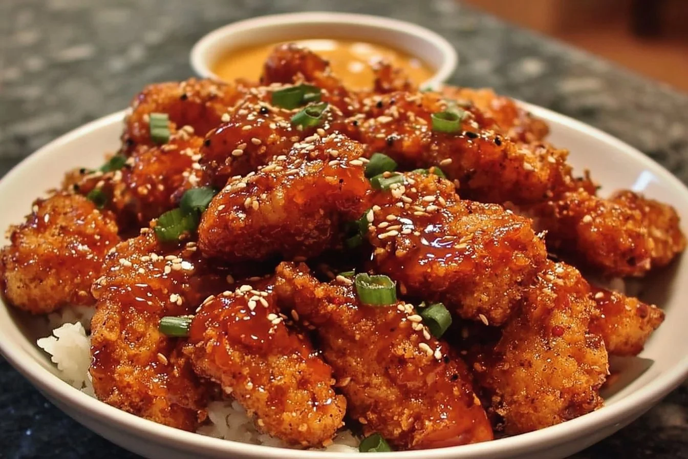 Crispy Bang Bang Chicken served with a spicy sauce and garnished