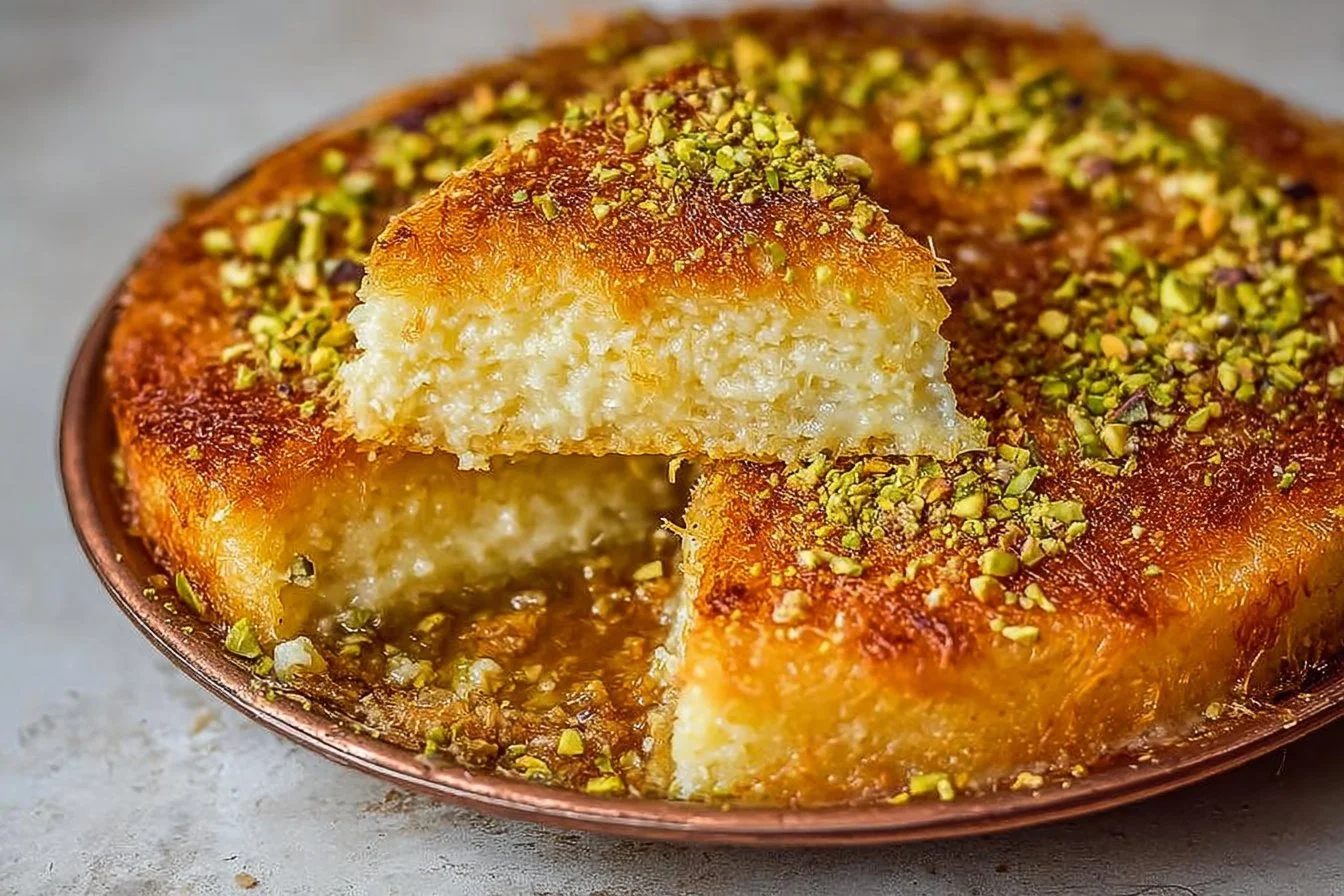 - Invert onto a platter and pour the cooled syrup generously over the Knafeh.