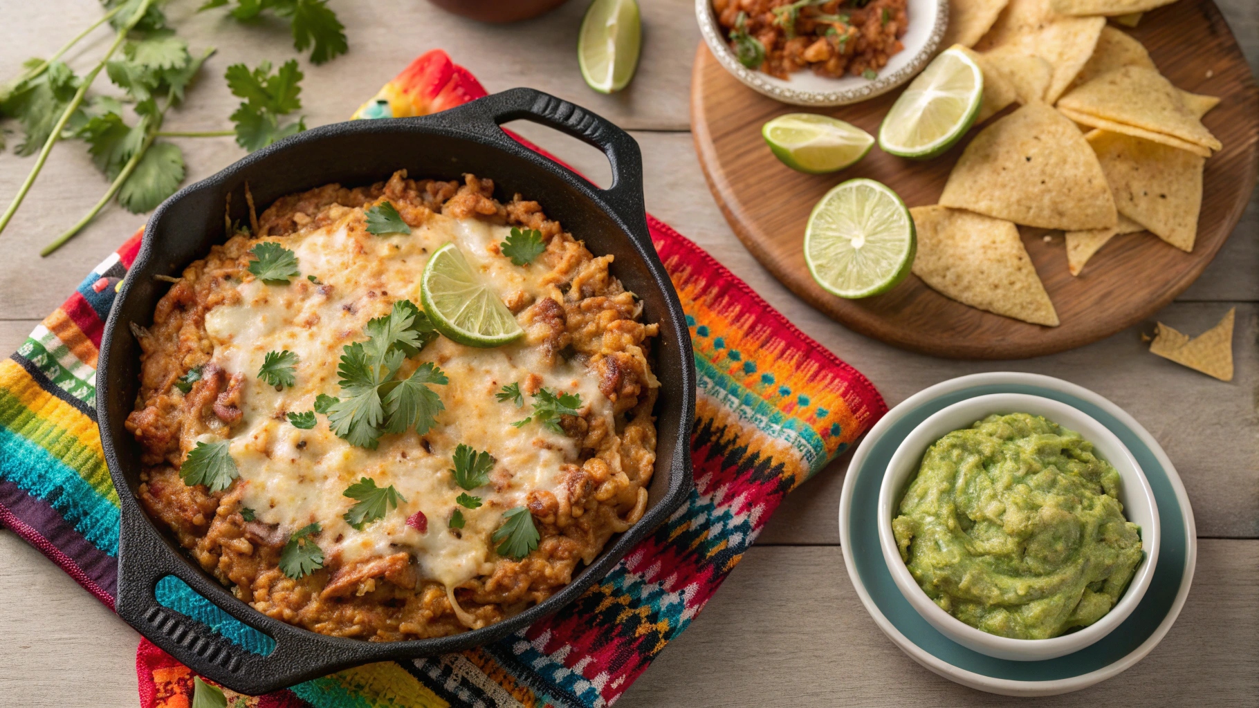 Skillet of cheesy chicken and rice with melted cheese, cilantro, and lime on a festive table