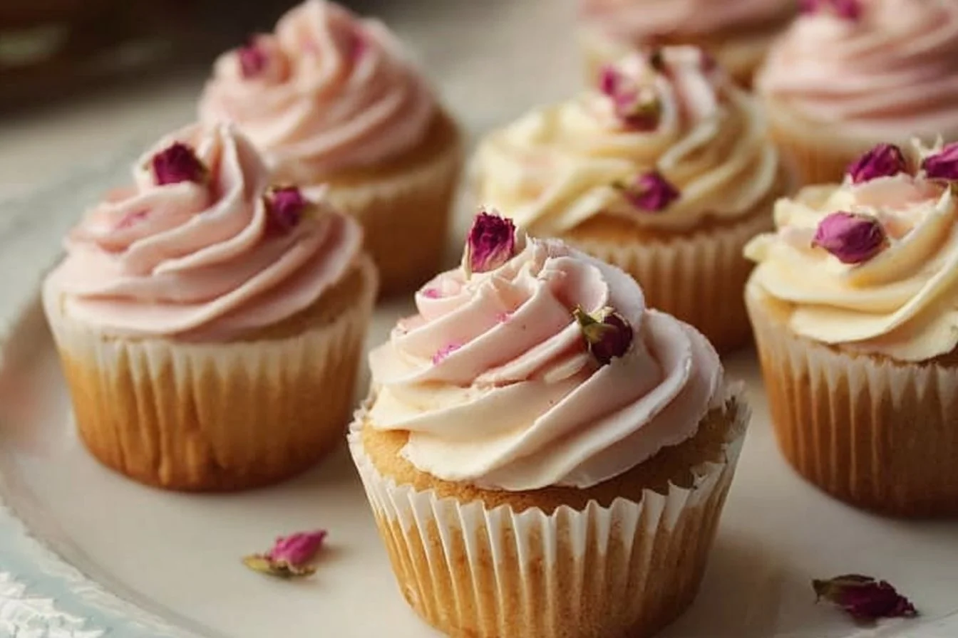 Place cupcakes on a flat tray or cake stand. Let them sit at room temperature for 20 minutes before serving so the flavors open. Garnish with a small dried rose bud or a few edible petals on top. Serve with tea or coffee.